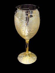 Hand Painted - 8 oz. Wine Glass - These tulip shaped Wine Glasses are perfect for white, dessert, or sherry wines. A gift set of pair of them partnered with a carafe, small bowl or snack plate will be treasured for years to come. They are exquisitely hand painted with our specially formulated non-toxic paint in your choice of Bellissimo!'s many dazzling designs. - Design chosen for this Wine Glass: ANGEL WINGS - DESIGN DESCRIPTION: The original name of this design has been long forgotten because a store owner unwittingly renamed it when she exclaimed, 'Oh, it looks like beautiful angel wings!'. Shimmers of twinkling gold and silver accentuate the ethereal look of this elegant and heavenly design. A combination of your favorite china, with glassware exquisitely hand painted in these Angel Wings will enhance the beauty of your finest laid table. Read more...