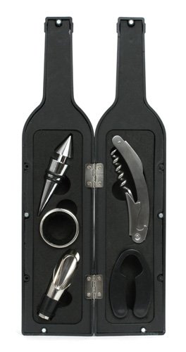 Wine bottle shaped wine tool kit with combo corkscrew/bottle opener, drip stop ring, stopper, foil cutter and combo pourer/stopper. Chrome metal tools in ABS plastic wine bottle shaped case. Read more...