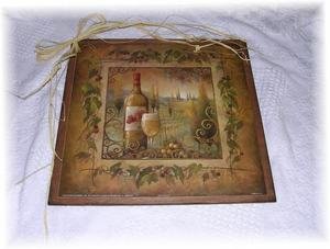 We've sealed this Villa Tuscan white Wine print onto wood giving it a framed appearance. The background color is a chocolate brown color with touches of black to accent the print. It measures approximately 13" squared by 1/4" thick (wood dimensions not including hanger). We've added a rusty tin wire hanger accented with a raffia ribbon bow for easy hanging and added charm Read more...