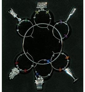 Wine Glass Charms with Holding RingJust clip these decorative charms to your stems so your guests can always keep track of their own glass. Crafted from fine pewter with lustrous gold or silver finish, they have full detail on each side. Holding ring included for easy storage and to display charms on a wine bottle. Set of 6 comes in an attractive open window display box. Read more...